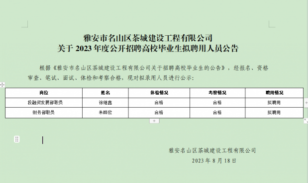 雅安市名山區(qū)茶城建設(shè)工程有限公司關(guān)于2023年度公開(kāi)招聘高校畢業(yè)生擬聘用人員公告...