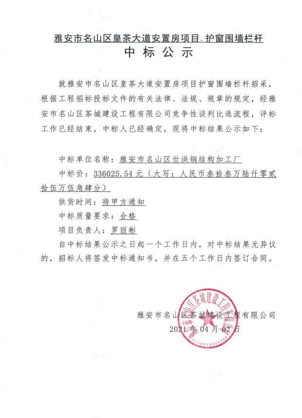 雅安市名山區(qū)皇茶大道安置房項(xiàng)目護(hù)窗圍墻欄桿中標(biāo)公示